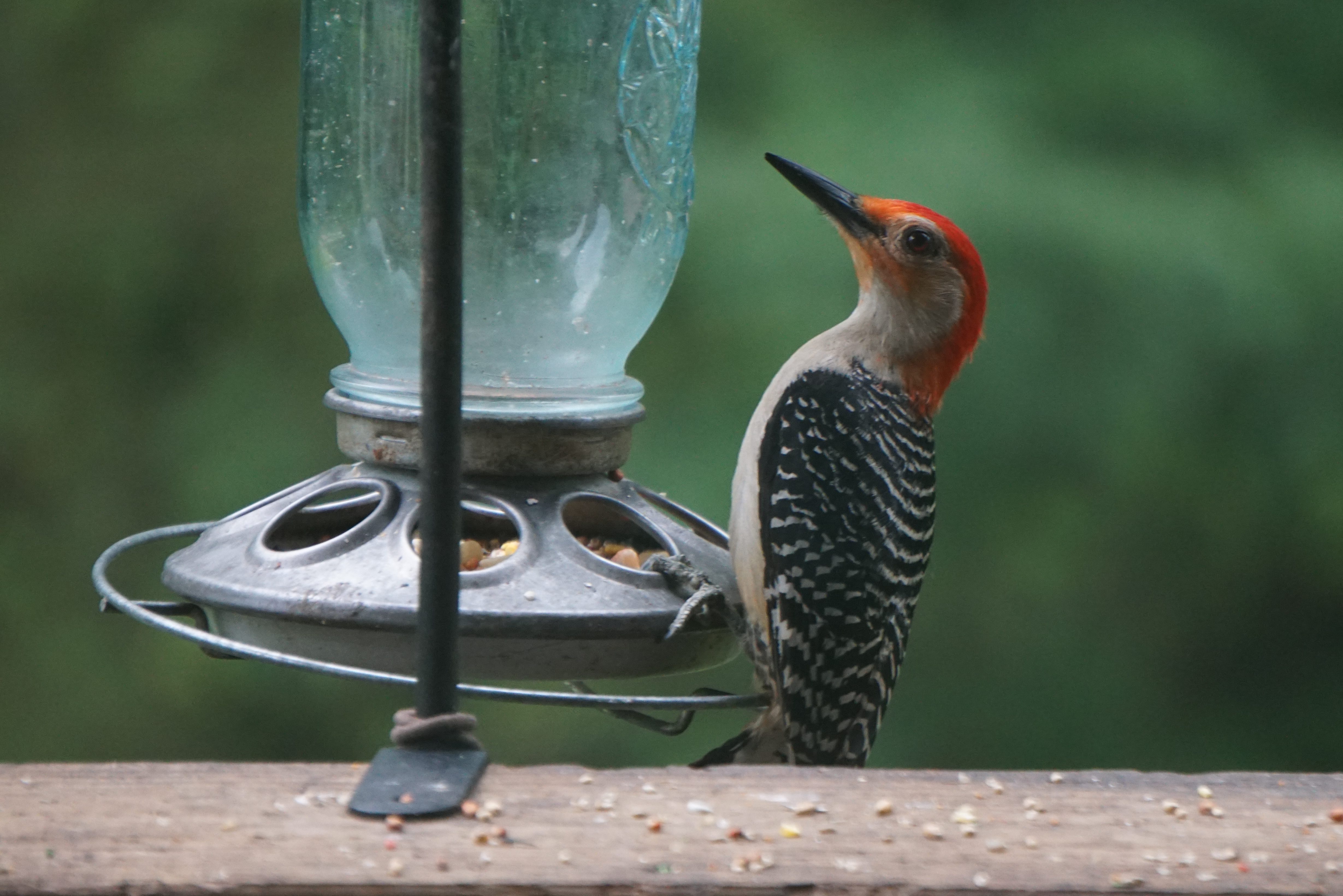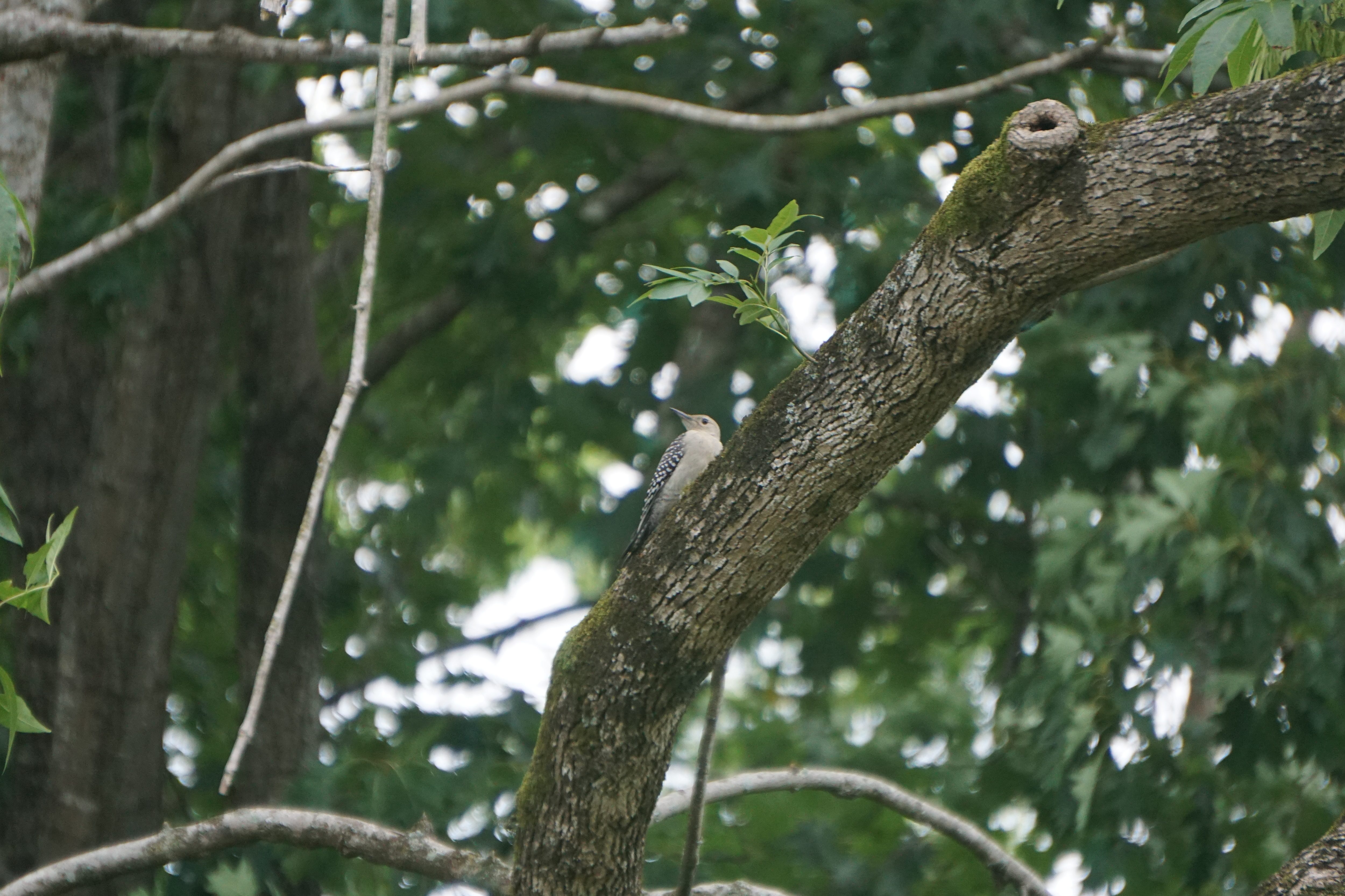 The red-bellied woodpecker seen here is a medium-sized woodpecker with black and white barring on its back and wings. It has a red cap which is complete in the male and incomplete covering only the neck in the female above. The juvenile lacks the red cap as is seen below.