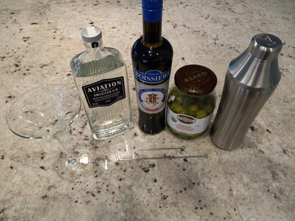 A classic martini can be made with vodka or gin, and a dirty martini includes olive juice or brine, the more brine, the dirtier the martini. We like it extra dirty! Gather your ingredients: Gin (Aviation), Extra Dry Vermouth, olive brine, green olives for garnish. Martini glass, cocktail shaker, cocktail skewer, scale or jigger for measuring.