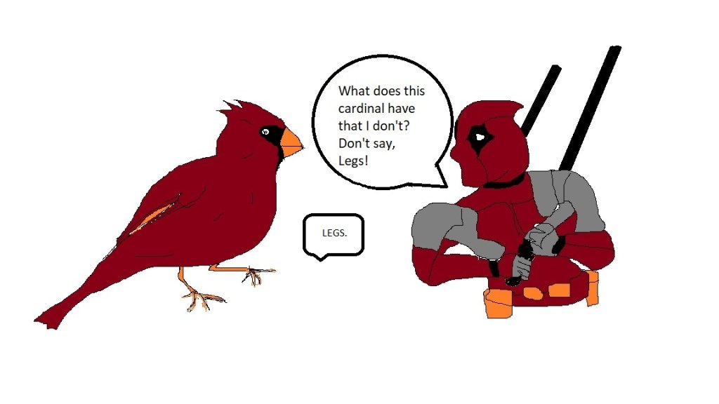 I already was a Ryan Reynolds fan (go Canada!), but this was magnified by his hilarious role as the anti-hero mercenary Wade Wilson in the Deadpool trilogy. If Deadpool was a bird… he would have to be the Northern Cardinal with the bright red male plumage, black masked face, and prominent crest at the back of the skull. Also, the cardinals seem to be trying win the dead pool this year for real. I had to beg my husband to bring a certain female to the compost pile after fracturing her cervical vertebrae yesterday flying straight into the door window π¦ Cardinals are very territorial and will often attack their reflections, mistaking them for intruder birds on their territory.