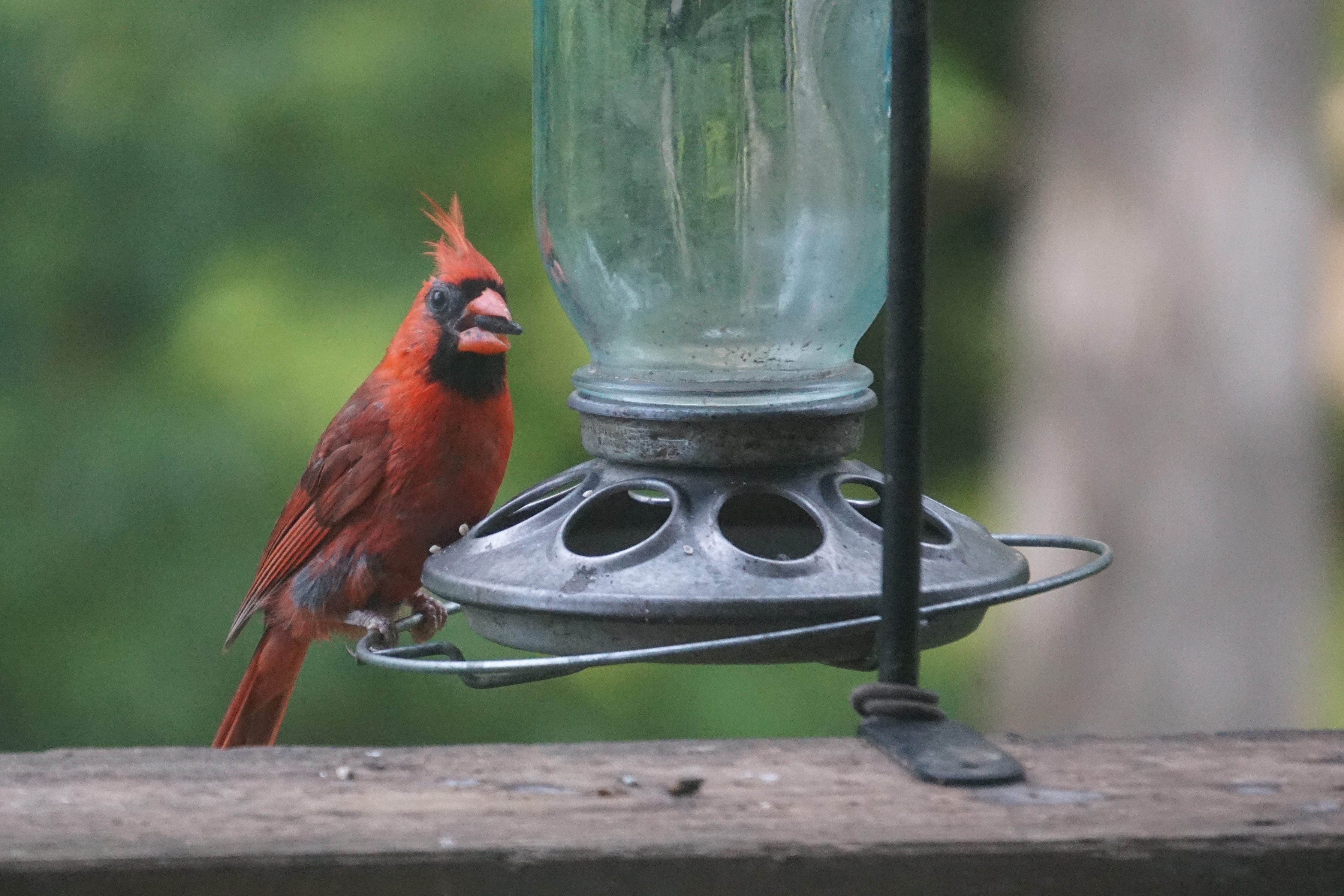 The Cardinal’s short thick orange bill is perfectly designed for breaking open their favorite snack of sunflower seeds along with many other types of seeds and fruit. They will also dine on a variety of insects. They do not migrate over winter and maintain their bright plumage all year round. The males always look a little rough in the summer, I assume from fighting or mating practices that ruffle/ pull out their feathers. The juveniles like the young female below will develop the bright orange beak and smoother plumage as they mature.