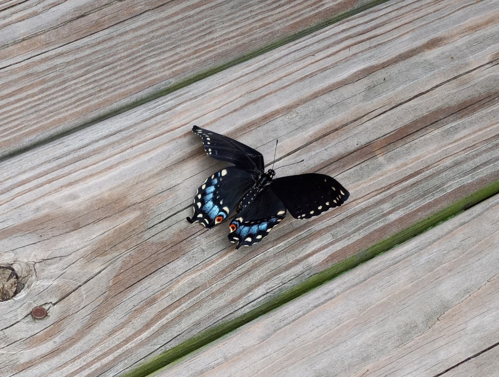 One of the caterpillars found a safe spot underneath the siding and formed its chrysalis. Emerging about two weeks later, the adult female with its prominent blue rows remained for a few hours gaining her strength before departing to begin her short last phase of life. I suspect that she made good use of that time, returning to lay her eggs on the same plant that gave her nourishment, as we are currently hosting about fifteen caterpillars (including a lazy caterpillar who formed its chrysalis on the plant). So, reproductively she succeeded in propagating her genetics and completing her purpose in life.