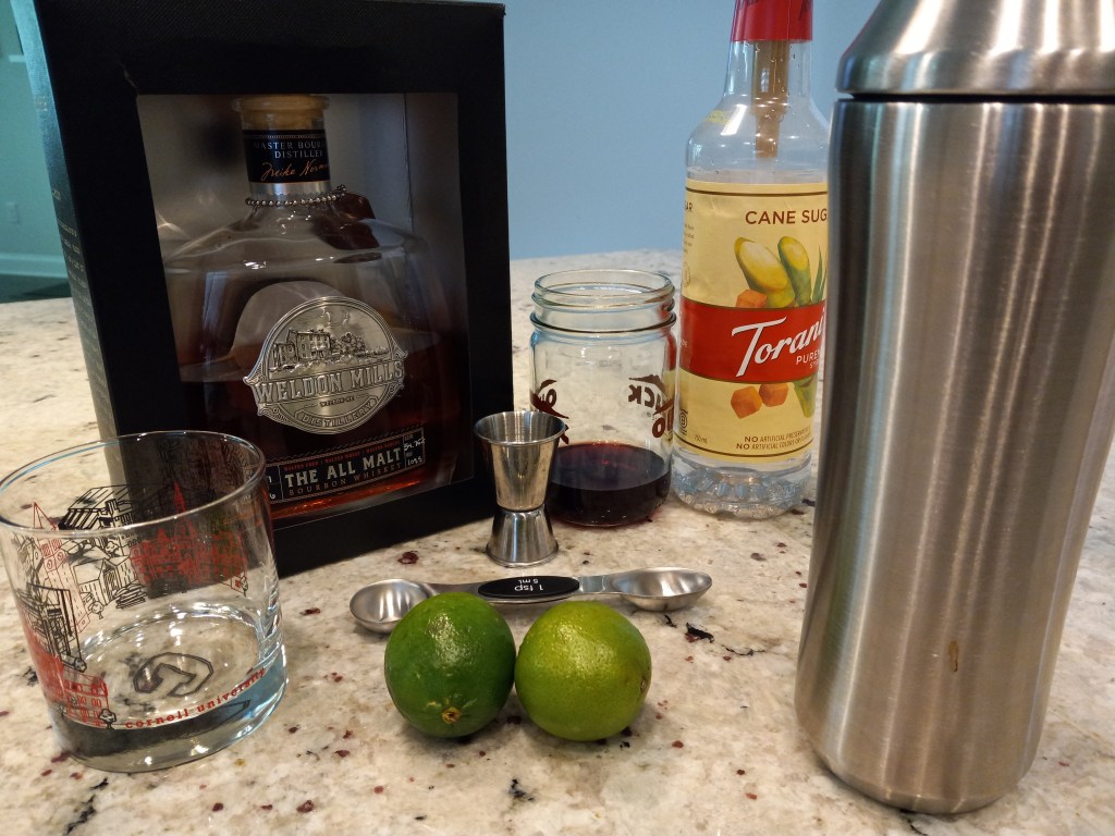 Gather your ingredients: bourbon, grenadine, simple sugar, limes, cocktail shaker, rocks glass, jigger and teaspoon.