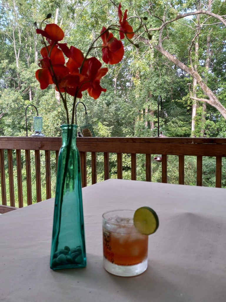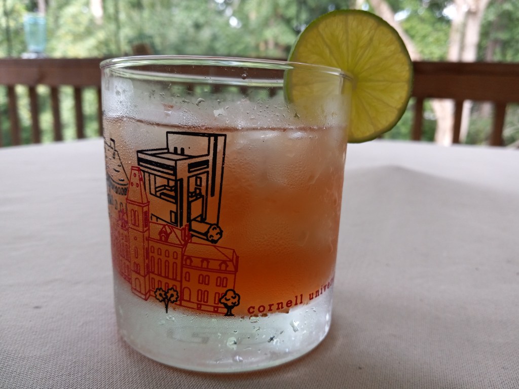 To raise a glass to my feline Cornell, I made one of the first cocktails I learned to make and enjoy, a New York cocktail (not to be confused with a NY Sour) and presented it in my Cornell Old Fashioned glass. I used Weldon Mills’ All Malt, their flagship bourbon. I made the grenadine by boiling a 50:50 pomegranate juice/ sugar mixture, though using a bottled grenadine will produce a brighter pink color.