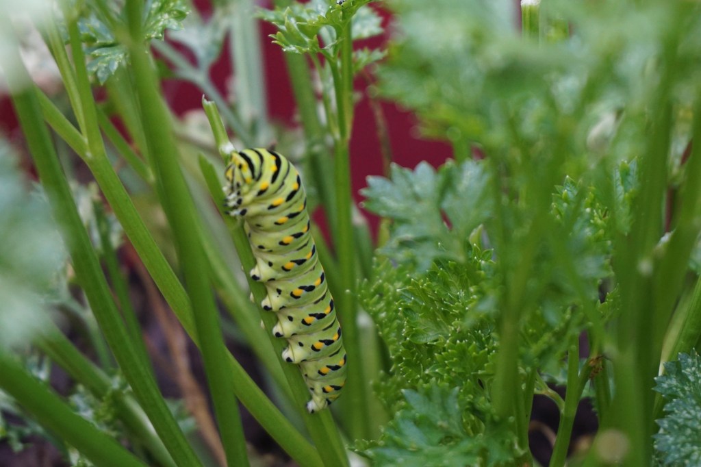 Our deck garden this year produced a plentiful parsley harvest. One afternoon I noted two vibrant caterpillars munching away at the leaves and stems. The eastern black swallowtail (Papilio polyxenes), like all butterflies, lives a unique life made up of four stages – egg, caterpillar, chrysalis, and adult. Their small yellow eggs hatch in about seven days. The caterpillar larvae transform from a teeny black with white “saddlebag” first instar, to the vibrant green with black stripes and yellow spots with its later instars over ten to thirty days. Their chrysalis or pupal stage spans eighteen days but may vary with temperature. After all this effort, the adult butterfly only lives about two weeks.