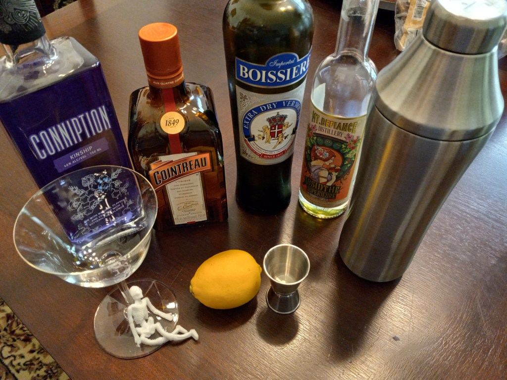 Gather your ingredients: Gin (Conniption), Cointreau, dry vermouth, juice of one lemon, absinthe, sour or coupe glass, cocktail shaker, jigger, sticky skeleton garnish.