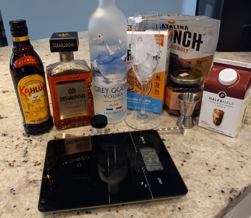 Gather your ingredients: Vodka (Grey Goose), coffee liqueur (Kahlua), amaretto (Disaronno), half-and-half, edible black glitter (optional), regular or espresso ice cubes (optional). For garnish: vanilla cookie, chocolate cereal, mini chocolate chips. Flute, scale or jigger, and bar spoon for stirring and slowly pouring over the second layer.